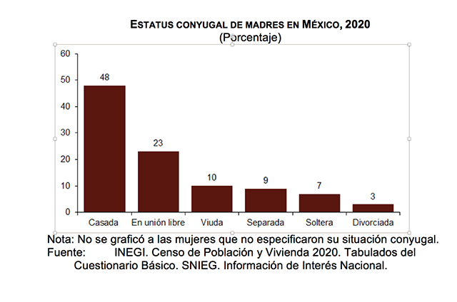 Los datos del Censo de Población y Vivienda 2020 muestran que 48 por ciento de las madres en México reportaron estar casadas, 23 por ciento vivían en unión libre, 10 por ciento eran viudas, nueve por ciento estaban separadas, siete por ciento informaron estar solteras y tres por ciento indicaron ser divorciadas.