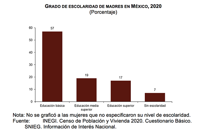 En 2020, más de la mitad de las madres mexicana (57 %) contaban con educación básica, 19 por ciento habían cursado educación media superior y solo 17 por ciento tenían educación superior. Por el contrario, siete por ciento de las madres reportaron no contar con ningún nivel de escolaridad.