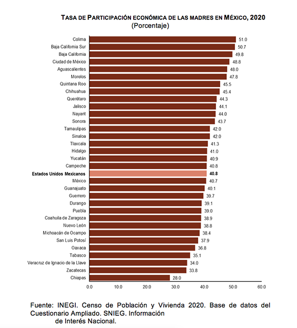 Colima es la entidad con más alta participación económica de las madres (51 %), ubicadas 10 puntos porcentuales por arriba del promedio nacional. Le siguen Baja California (50.7 %), Baja California Sur (49.8 %), Ciudad de México (48.8 %) y Aguascalientes (48 %).
