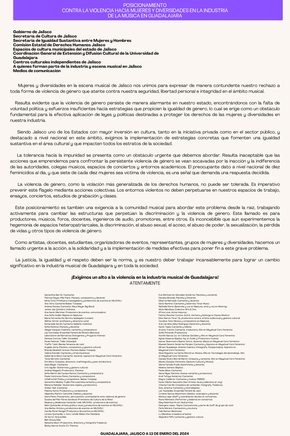 Personas músicas, cantantes, productoras, compositoras, docentes de música y arte, estudiantes, creadoras de contenido, fotoperiodistas y fotógrafas, artistas audiovisuales, gestoras y promotoras culturales, artistas, perfomanceres, DJ, cineastas, compositoras, comunicadoras cantautoras, entre otras mujeres y diversidades que integran la escena de la música en Guadalajara se pronunciaron en contra de las diversas formas de violencia de género que experimentan dentro de la industria.