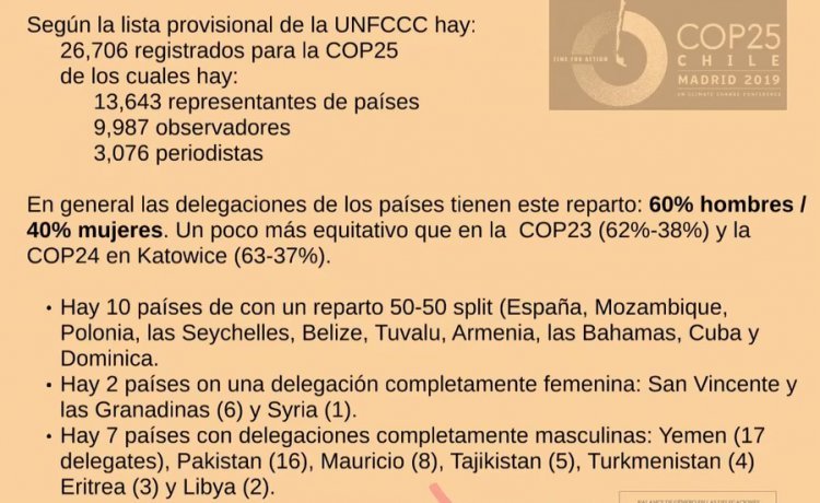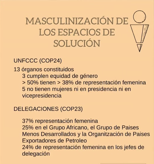 Pero, a pesar de que las mujeres son las más afectadas por el cambio climático, son también las que menos representación tienen en los órganos de poder desde los que se lucha contra este fenómeno. Si bien en Naciones Unidas reconocen el principio de paridad en la conformación de los órganos de decisión, vemos que esto no se refleja en las COP, marcadas todavía por una masculinización de los espacios de decisión. Por eso son muy importantes los esfuerzos realizados en distintos ámbitos para incluir la participación de las mujeres en el diseño e implementación de propuestas orientadas a “salvar el planeta”.